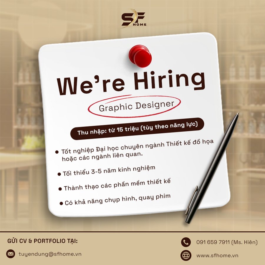SF Home mong muốn một ứng viên đầy nhiệt huyết và tài năng để tham gia cùng chúng tôi trong hành trình phát triển và thành công. Tham gia vào một môi trường làm việc đầy sáng tạo và động lực, nơi bạn có thể phát triển kiến thức và kỹ năng trong lĩnh vực thiết kế, sáng tạo.