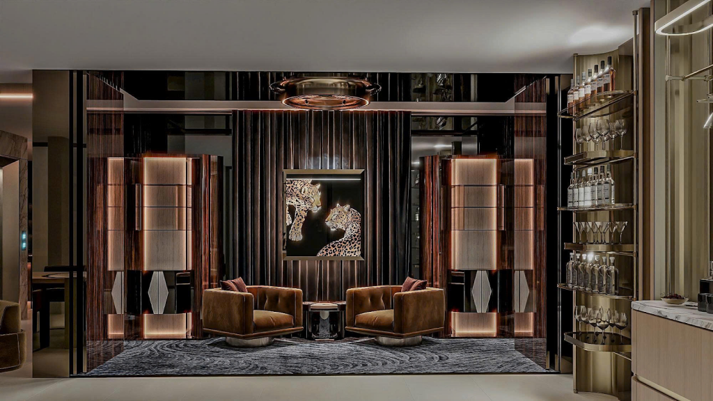 Các đường viền kim loại ánh đồng chạy dọc theo vách tường, tủ rượu, và viền đèn vừa đóng vai trò trang trí, vừa dẫn dắt ánh nhìn, tạo nên cảm giác chuyển động nhẹ trong không gian tĩnh. Đó là thứ chuyển động tinh tế mà chỉ những ai thật sự tinh tế mới cảm nhận được.