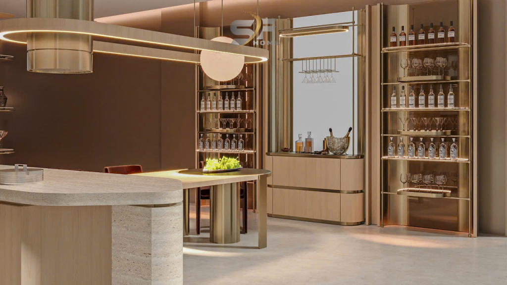 Trong tổng thể gian bếp, tủ trưng bày ly và rượu không chỉ đơn thuần là nơi lưu giữ những chiếc ly pha lê hay những chai rượu quý, mà còn đóng vai trò như một “không gian trải nghiệm”, nơi gia chủ có thể tạm gác lại nhịp sống bận rộn, tự thưởng cho mình một khoảnh khắc thư thái. SF HOME đã kiến tạo góc nhỏ này trở thành một tác phẩm nghệ thuật, nơi sự tinh tế và đẳng cấp được phô diễn qua từng chi tiết. Từ vách inox mạ vàng champagne uốn cong mềm mại, đến hệ giá treo và kệ đựng ly đồng bộ. Tất cả hòa quyện để khơi gợi cảm giác như đang “chill” trong một quầy bar sang trọng của khách sạn 5 sao ngay trong chính ngôi nhà của mình.