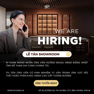 Tuyển dụng Lễ tân Showroom. SF Home mong muốn một ứng viên đầy nhiệt huyết và tài năng để tham gia cùng chúng tôi trong hành trình phát triển và thành công.